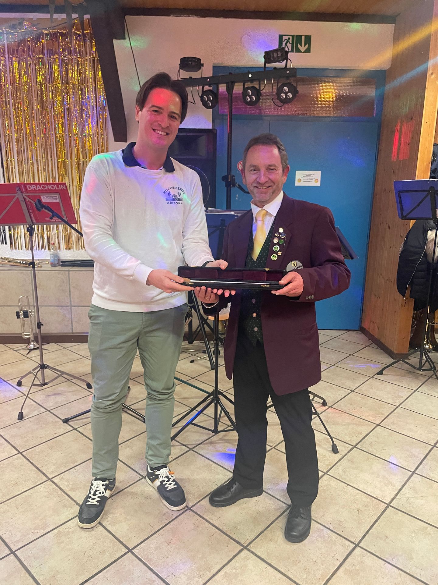 Als zweite Überraschung des Abends stellte Moderator Frank Bechtle den neuen Dirigenten des Stammorchesters, Daniel Crespo vor. Der 43jährige hatte sich zusammen mit weiteren Interessenten auf die ausgeschriebene Dirigentenstelle beworben und in einem Probedirigat im Dezember die Musikerinnen und Musiker überzeugt. Mit der Unterschrift unter seinen Dirigentenvertrag besiegelte Daniel Crespo sein künftiges Arbeitsverhältnis bei der MKM und bekam vom bisherigen musikalischen Leiter Reinhard Steiner einen Taktstock überreicht. Mit diesem dirigierte Crespo sogleich sein erstes Musikstück, die Polka „Wir Musikanten“.