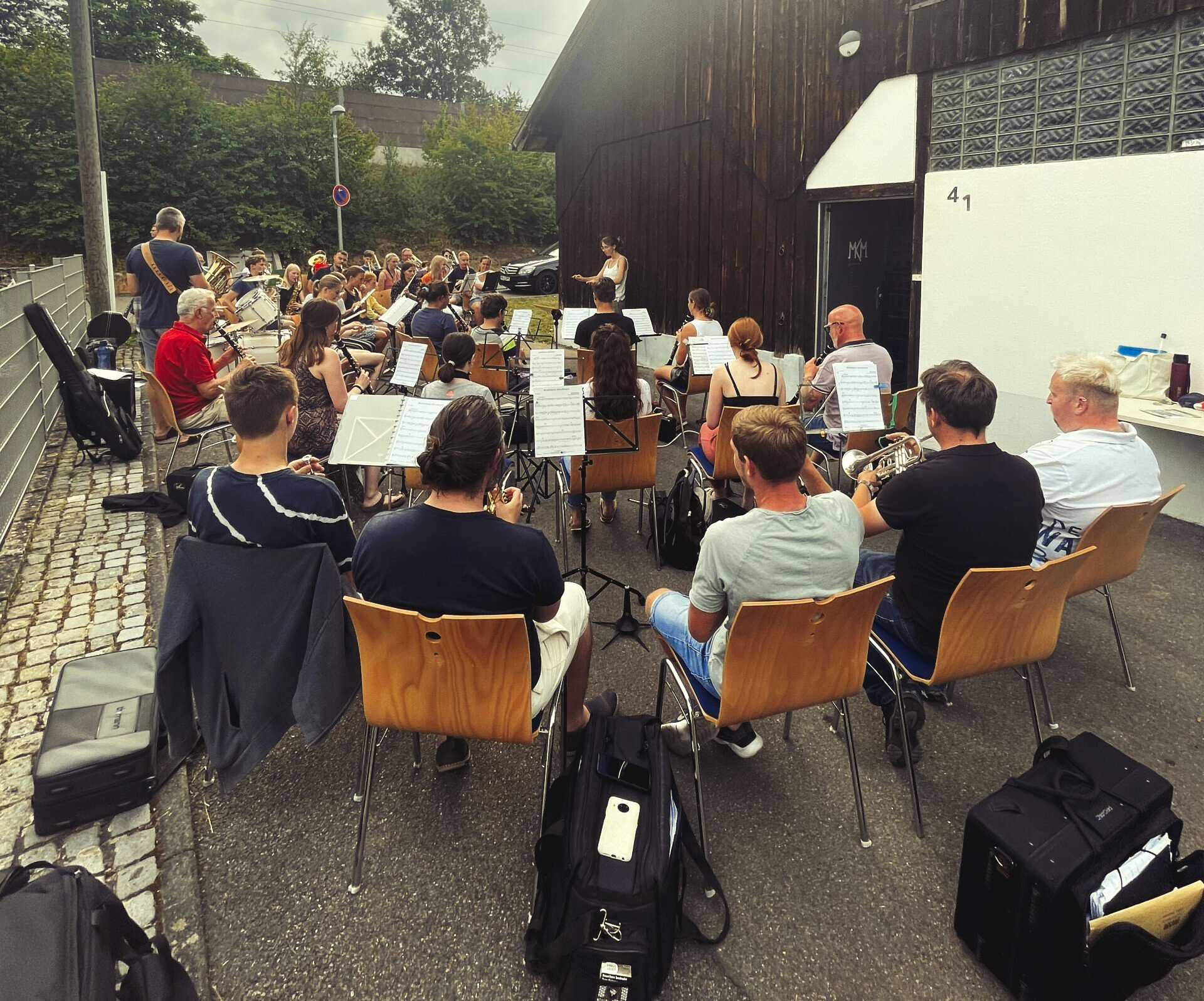 Dirigentin Doreen Schneider probte mit den rund 40 Musikerinnen und Musikern eine Stunde lang Titel wie Aladin, Bohemian Rhapsody, Superstition und vieles mehr. Wegen eines herannahenden Gewitters musste die Open-Air-Probe leider nach zwanzig Minuten in den Bockstall verlegt werden, der danach aus allen Nähten platzte.