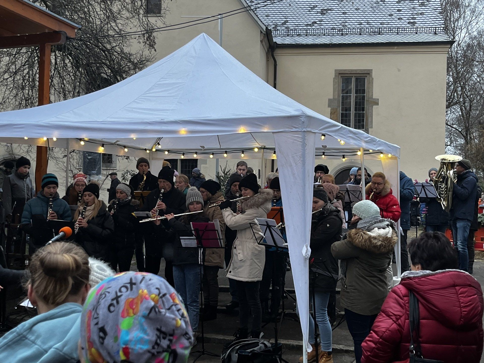 Am Wurststand der MKM brummte der Laden. Wirtschaftsleiter Marcel Deutsch hatte den Tag generalstabsmäßig vorbereitet, so dass überpünktlich um 10.30 Uhr am Morgen der Duft frisch gebratener Würste über den Markt wehte. Als wahrer Renner entpuppte sich hierbei die Currywurst, die stilecht mit Oberländer und warmer Currysoße angeboten wurde. Aber nicht nur kulinarisch war die MKM spitze - mit modernen und traditionellen Weihnachtsliedern unterhielten Jugendkapelle und Stammorchester unter der Leitung von Jugenddirigentin Doreen Schneider das Weihnachtsmarktpublikum und erntete für ihren Auftritt viel Applaus.