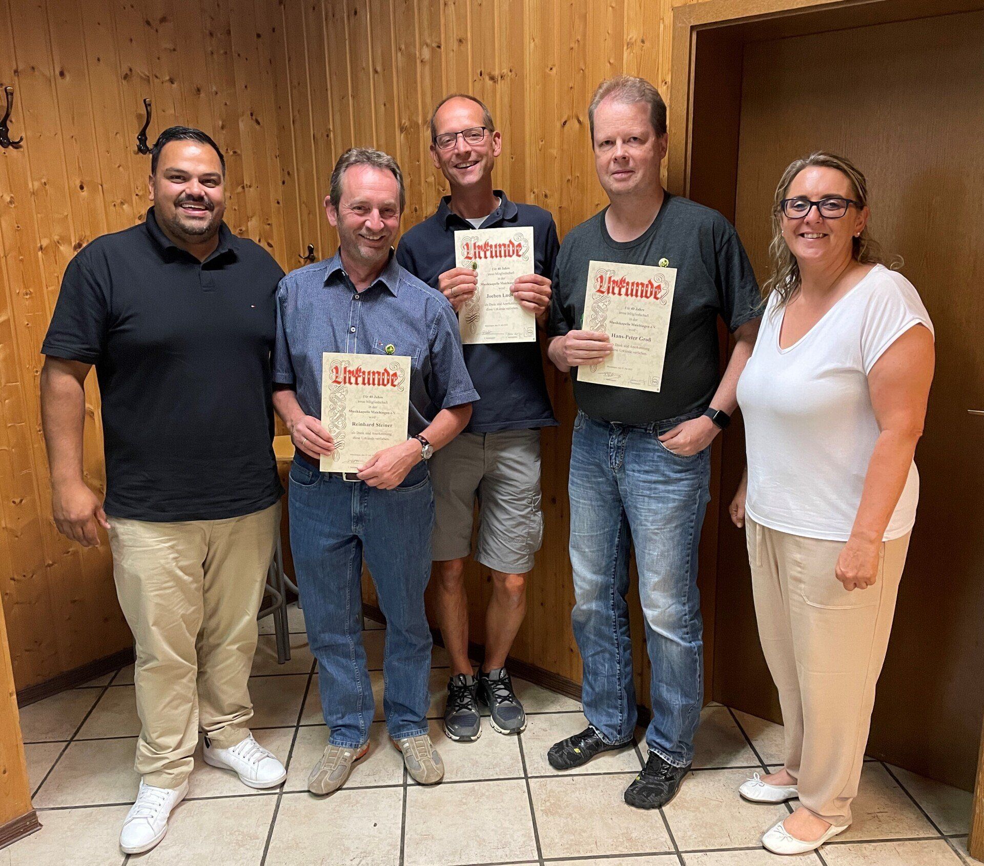 Gleich einen ganzen Ehrungsmarathon hatten die beiden Vereinsvorsitzenden Benjamin Schilling und Jana Hovoritsch sowie Harald Zeeb vom Böblinger Blasmusikkreisverband zu absolvieren: