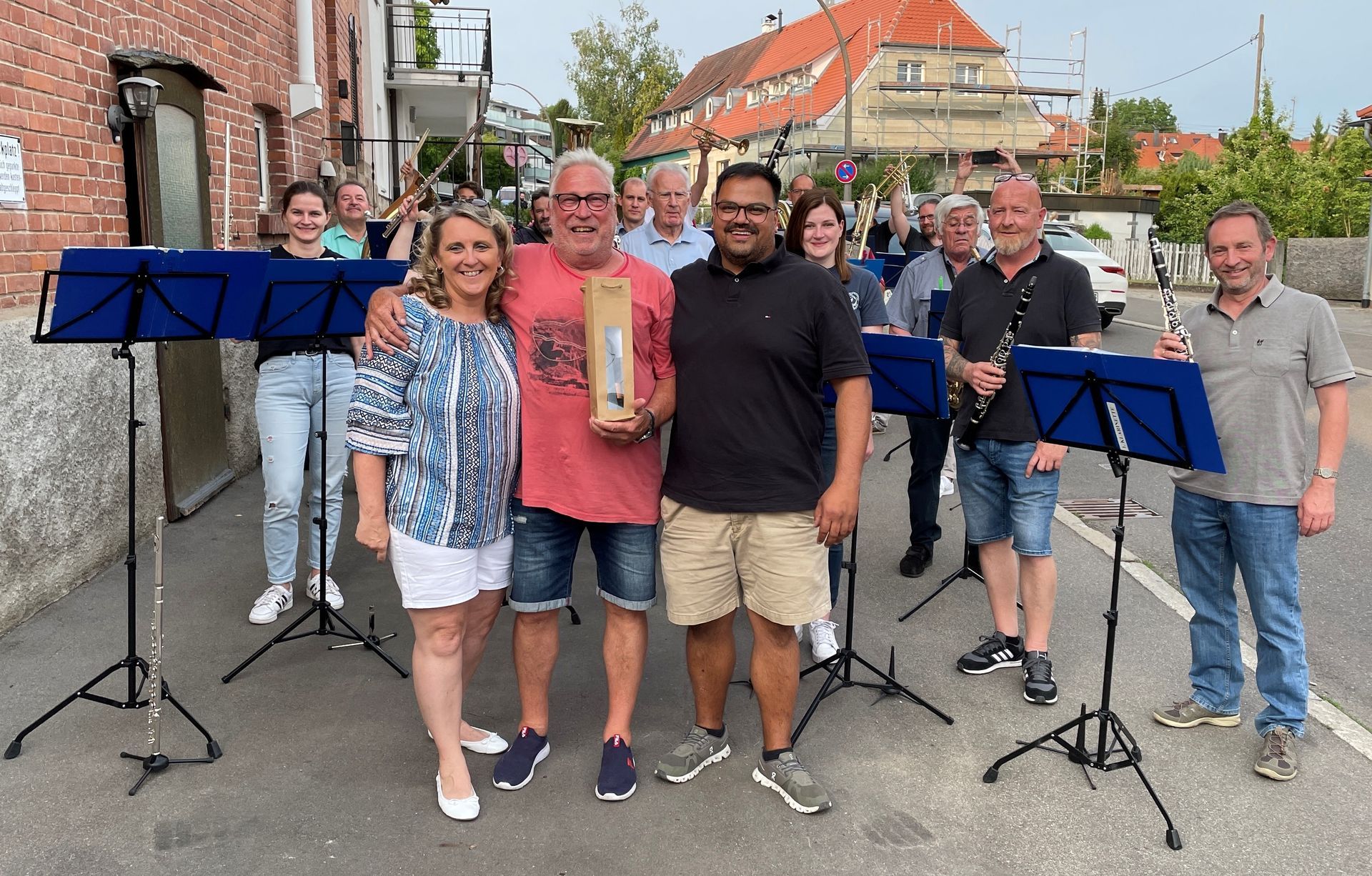 Er ist exakt so alt wie der Verein, in dem er seit vielen Jahren Ehrenmitglied ist. Die Rede ist von Peter Hoffmann, der am Donnerstag seinen 70. Geburtstag feierte. Über mehrere Jahrzehnte war Peter Hoffmann Tenorhornist in der Maichinger Musikkapelle. Neben der Musik machte sich der Jubilar als "Feschtlesmacher" einen Namen, indem er über viele Jahre das Amt des MKM-Wirtschaftsleiters inne hatte und damit maßgeblichen Anteil an der Organisation der großen MKM-Veranstaltungen wie z.B. der Maihocketse, dem Weihnachtsmarkt oder dem Kinderfasching. Zudem verwaltete er lange Zeit den Bockstall. Grund genug also dem junggebliebenen Jubilar ein zünftiges Geburtstagsständchen zu bringen. Hierzu hatte MKM-Vizedirigent Reinhard Steiner eine stattliche Anzahl Musikerinnen und Musiker zusammengerufen, die Peter Hoffmann bei strahlendem Sonnenschein vor seinem Haus in der Burghaldenstraße ordentlich den Marsch bliesen. Das Geburtstagkind genoss sichtlich die Musik seiner Maichinger Kameradinnen und Kameraden und griff bei der Polka "Ein halbes Jahrhundert" sogar selbst zum Taktstock. Die beiden MKM-Vorsitzenden Benjamin Schilling und Jana Hovoritsch überbrachten dem Jubilar im Anschluss an das Ständchen die Glückwünsche des Vorstandes. Das Geburtstagskind lies sich nicht lumpen und lud die Kapelle kurzerhand zur Roten im Weckle und kühlem Flaschenbier ein - ganz so wie in alten Zeiten.