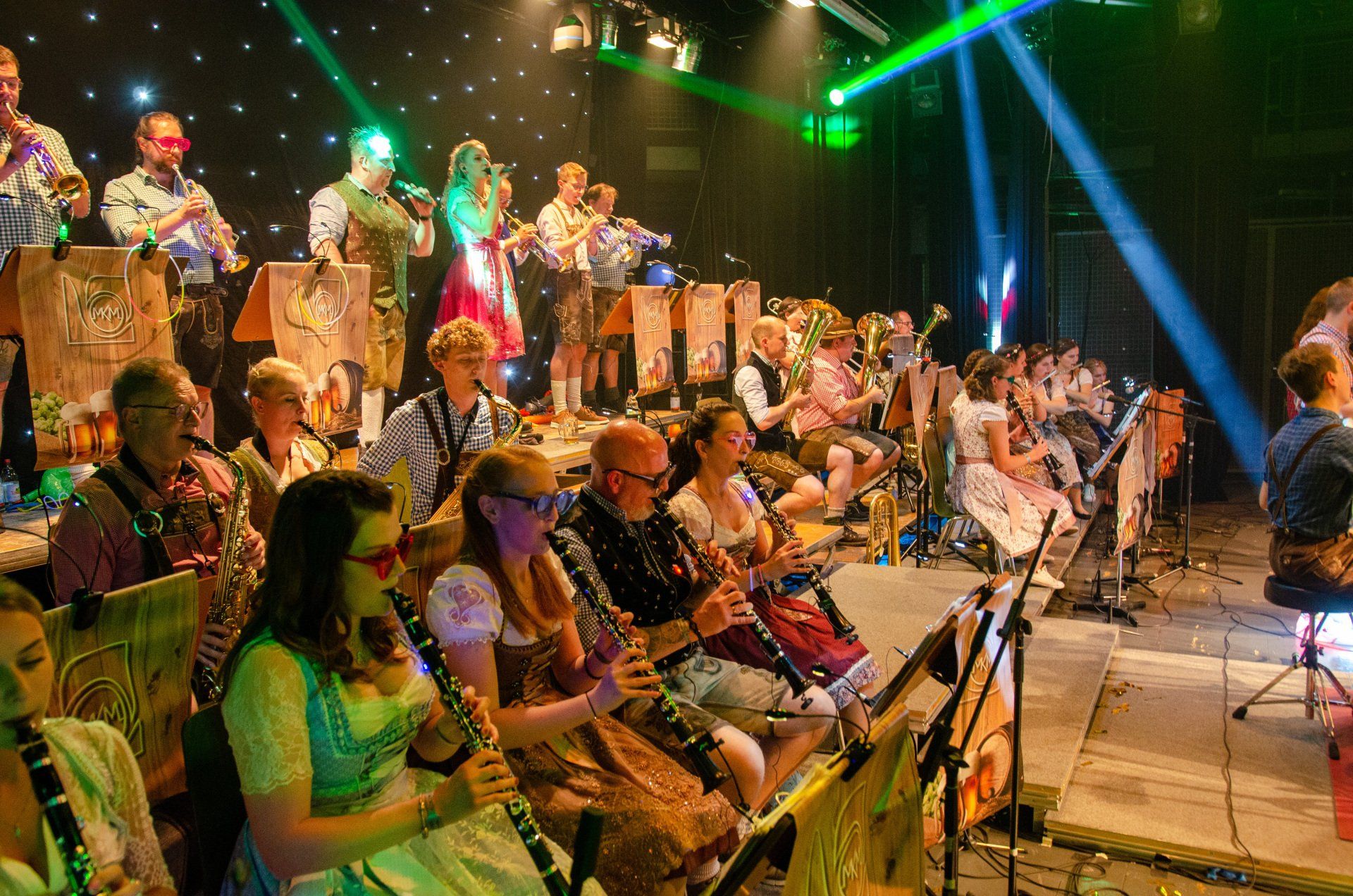 Hingucker und vor allem aber Hinhörer des Abends ist Sängerin Julie Roth, die sich eigens für den Oktoberfäschdauftritt ein Dirndl hatte Maßschneidern lassen. Ihre enorme stimmliche Bandbreite stellt die 25jährige Saxophonistin mit Hits von Helene Fischer bis ACDC eindrucksvoll unter Beweis. Gesangseinlagen gibt es zudem von Schlagzeuger Philipp Grund, Dirigent Reinhard Steiner und MKM-Trompeter Frank Bechtle. Letzterer singt zusammen mit dem Publikum den Karel Gott Schlager “Biene Maja“ und sorgt mit lustigen Trinksprüchen, welche die MKM zuvor in einem Onlinewettbewerb gesammelt hatte immer wieder für Lacher. Und auch Ortsvorsteher Wolfgang Stierle greift zum Gesangsmikrophon und eröffnet kurz vor Mitternacht das letzte Set mit „Zehn kleine Jägermeister“.