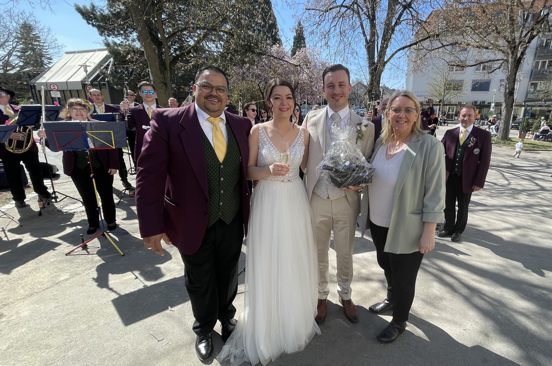 Hatten sie am Abend zuvor noch den Bürgerhausvorplatz nach der Maihocketse gefegt, standen die Musikerinnen und Musiker der MKM am Freitagmorgen schon wieder vor dem Bürgerhaus, dieses Mal jedoch in Uniform und mit Instrument. Der Anlass hierfür war ein schöner: MKM-Trompeter Philip Schumacher heiratete Flötistin Simone Frank. Ehrensache für die Aktiven der MKM ihrem Brautpaar ein musikalisches Hochzeitsständchen zu bringen. Die Vereinsvorsitzenden Benjamin Schilling und Jana Bechtle überbrachten dem Brautpaar die Glückwünsche des Vorstandes und überreichten als Vereinsgeschenk einen Johannisbeerstrauch für den heimischen Garten. Bei der Polka Böhmischer Traum ließ sich das Brautpaar nicht lange bitten und übernahm gekonnt die Dirigentschaft des Orchesters. Die MKM wünscht Philip und Simone für ihren gemeinsamen Lebensweg alles Gute.