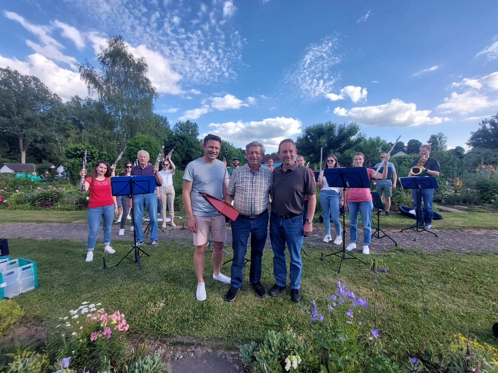 Am Freitag feierte Franz Steiner seinen 85. Geburtstag. In der Kleingartenanlage Ochsenallmend überraschte die Musikkapelle ihren junggebliebenen Jubilar mit einem Geburtstagsständchen. Mit der Polka „Auf der Vogelwiese“, dem Marsch „Fliegerparade“ sowie dem Blasmusikhit „Wir Musikanten“ gratulierten die Maichinger Musikerinnen und Musiker ihrem Geburtstagskind musikalisch. MKM-Kassier Benjamin Jornitz und Dirigent Reinhard Steiner überbrachten Franz Steiner die Glückwünsche des Vorstandes. Dieser ließ sich nicht lumpen und lud spontan die gesamte Kapelle zu einem ausgiebigen „Ständerling“ ein. Bei Bier, Cola und dem ein oder anderen Schnäpschen ließen die Musiker Franz Steiner hochleben.