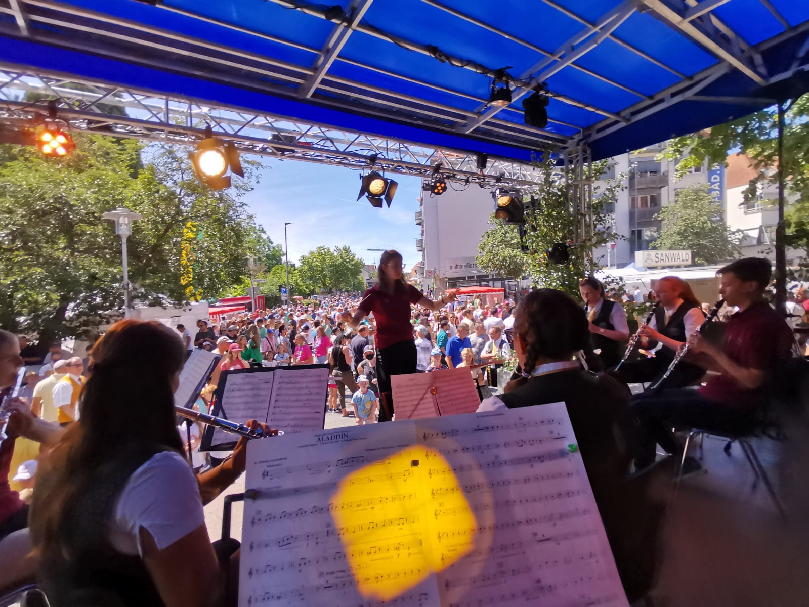 Eine arbeitsreiche Woche liegt hinter den Aktiven der MKM. Los ging es am Dienstagabend mit einer dreistündigen Sonderprobe für den Abendauftritt beim Maichinger Kinderfest. Kurz vor Probenbeginn hatten sich mehrere Musiker, darunter einer der beiden Schlagzeuger krankgemeldet, so dass diese kurzfristig durch Aushilfen ersetzt werden mussten. In mehreren Telefonaten gelang es Vizechefin Jana Hovoritsch schließlich über die Maichinger Musikschule Drumlab Ersatz zu finden, um den Auftritt am Samstag zu retten.