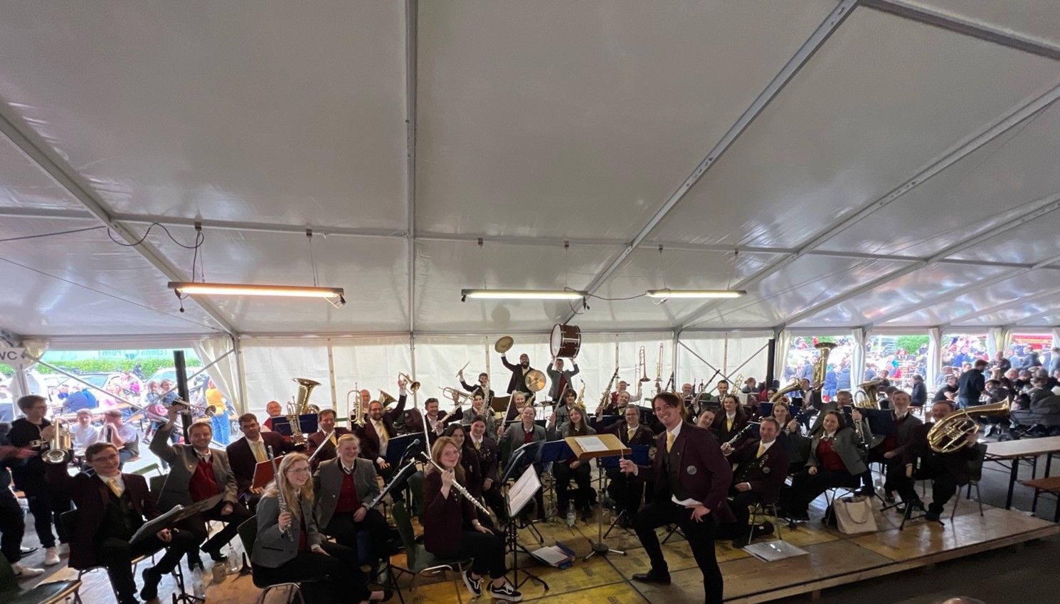 Doch für die Maichinger Musiker:innen war der Vatertag noch nicht zu Ende. Beim Göckelesfest der Feuerwehr-Musikkapelle Dagersheim sorgte die MKM im Festzelt für gute Laune und ausgelassene Stimmung. Musikalisch unterstützt wurden die MKMler hierbei von ihren Musikerfreunden aus Nufringen, welche am Vormittag in Weil im Schönbuch aufgetreten waren und vom gemeinsamen Dirigenten Daniel Crespo spontan nach Dagersheim mitgebracht worden waren. Ohne vorher gemeinsam geprobt zu haben, legte das rund 40köpfige gemischte Orchester einen bemerkenswerten Auftritt hin und heizte dem Publikum als Vorgruppe der Partykapelle „Schwippetaler“ ordentlich ein.